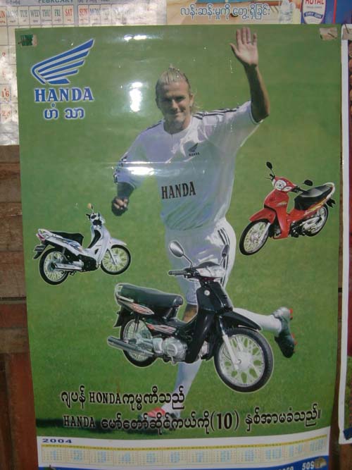 ちなみに、ベッカムは、ミャンマーで最もポピュラーなウィスキー、「グランドロイヤル」の宣伝にも起用され、ミャンマーではひっぱりだこだ。